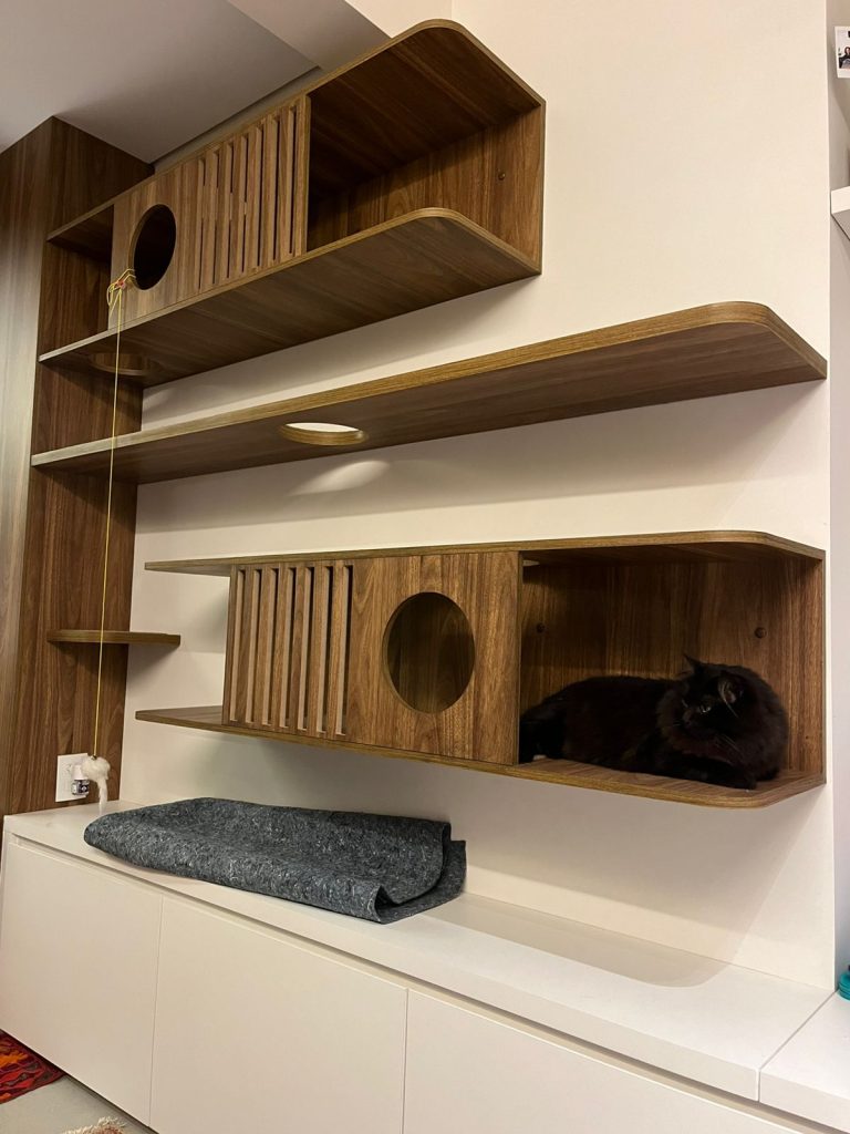 “Quando o projeto é feito um a um, pensando em cada animal da casa, o resultado é ainda melhor. Têm gatos mais velhos, por exemplo, que precisam de distâncias menores ou gatos maiores, que precisam de mais espaço e até mesmo os que têm alguma dificuldade”, continua a empresária, enfatizando que, quando a marcenaria é personalizada para cada cliente, as chances de realmente contribuir para o bem-estar dos animais aumentam muito.