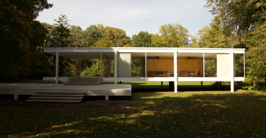 Outro exemplo de Gabriela é a construção de casas elevadas do solo, comum em regiões que sofrem com alagamentos. “Essa solução é comumente associada a resiliência a inundações e enchentes, mas também é uma ótima escolha quando falamos de calor extremo”, pontua, acrescentando que esse sistema pode ser observado na aclamada Casa Farnsworth de Mies van der Rohe (imagem acima) e nas tradicionais casas elevadas de populações ribeirinhas.